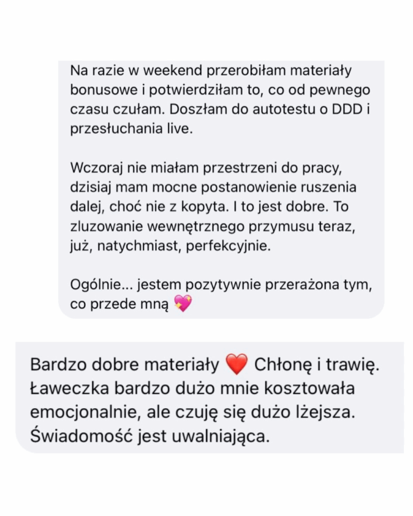➤ Wiesz już, skąd biorą się Twoje schematy (DDA, parentyfikacja, „muszę być silna”), tylko nie wiesz, jak tę wiedzę przełożyć na codzienne decyzje, granice i wybory